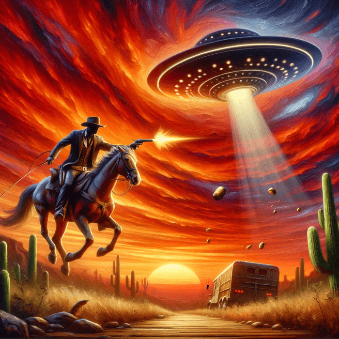 舞台は1850年アメリカ西部開拓時代。ゴールドラッシュに沸くテキサスタウンを襲撃したUFOに対抗するための装備を買って戦いに挑め!