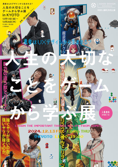 第3回GOOD DESIGN Marunouchi 公募企画展の選出企画である本展では、「ゲームと体験のデザイン」をテーマに、人生の中で誰もが体験するであろう【成長、勝利、仲間、困難、お金、挑戦、時間、考え方】をもとに制作したオリジナルゲーム(8作品)を全て無料でプレイできるほか、約550名を対象に実施したゲームにまつわるアンケート結果や、UXデザインとゲームの専門家インタビュー、ゲームに親しんできた各界のトップランナーのコメントなどを展示します。第3回GOOD DESIGN Marunouchi 公募企画展の選出企画として東京・GOOD DESIGN Marunouchiにて開催(2024年3月~4月)し、17,000名の来場を記録しました。人々を夢中にさせ社会に多大な影響を与えているビデオゲームに注目し、「ゲームから得られる学び」と「ゲームに仕込まれた体験のデザイン(UXデザイン)」を紐解きます。