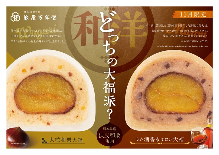 熊本県産和栗ペーストをふんだんに使用し、栗よりも栗らしい、圧倒的な存在感を楽しめる和風の『大粒和栗大福』(1個345円(税込)・常温販売)と、渋皮栗をラム酒に漬け込み、隠し味にダークチョコレートを加えて、芳醇な香りと味わいが余韻まで美味しい洋風な『ラム酒香るマロン大福』(1個345円(税込)・常温販売・1個当たりのアルコール含有量0.5%)を東京・自由が丘にある総本店をはじめ直販26店舗(東京・神奈川)にて販売いたします。