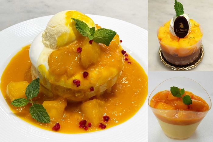 「フランス菓子 ラ・ポーズ」では近大マンゴーをふんだんに盛り付けたラ・ポーズ特製のマンゴープリンと、ミルクチョコレートベースのパッションフルーツのムースの上に「近大マンゴー」を贅沢にトッピングしたスイーツの2種を、「カフェ ラ・ポーズ ルクア大阪」ではマンゴーと甘夏を合わせた甘酸っぱいソースとバニラアイスをあしらった、ラ・ポーズ特製ふわふわパンケーキを販売いたします。