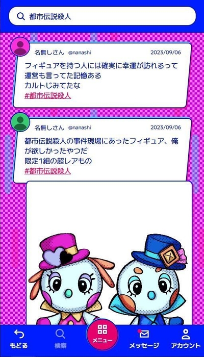 ゲームを進めていくと、SNS上のユーザーたちとメッセージ機能でコミュニケーションを取りながら情報を集める必要も。しかし登場人物たちは、誰もが裏がありそうな人々ばかり...。メッセージでのやり取りを通じて、一癖も二癖もある登場人物たちと渡り合いながら情報を引き出すことが、事件の闇を暴く重要な要素となります。