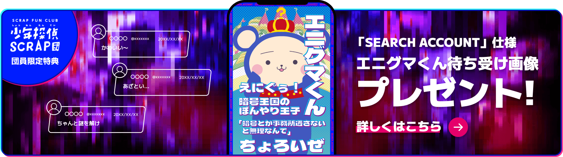 『SEARCH ACCOUNT』をご購入の団員には、「SEARCH ACCOUNT仕様エニグマくん待受け画像」をプレゼントいたします!!