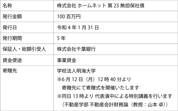 テクノロジーで気軽な住み替えをサポートする株式会社 property technologies(以下「当社」)のグループ会社である株式会社ホームネット(以下「ホームネット」)は、株式会社千葉銀行(以下「千葉銀行」)を引受先とする「地方創生私募債(愛称:みらいはぐくみ債)」を発行し、発行手数料の一部を用いて学校法人明海大学(以下「明海大学」)の学校教育促進につながる物品を寄贈いたします。