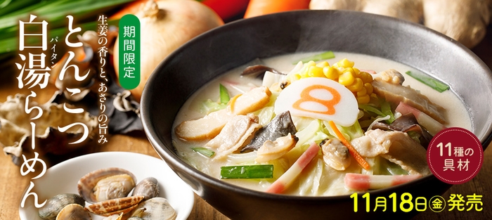 チェーン「8番らーめん」は、11月18日(金)から新メニュー「とんこつ白湯らーめん」を期間限定で販売いたします。たっぷりの野菜と豚肉やあさりなど11種類の具材を使用した具だくさんの言わば8番流ちゃんぽんらーめんです。