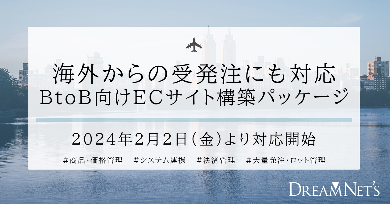 株式会社ドリームネッツ(本社:広島県福山市、代表取締役社長:井上 一成)は、CRMを搭載したBtoB向けECサイト構築パッケージ(以下、本製品)において、2024年2月2日(金)より海外からの受発注業務にも利用可能なシステム構築へ対応いたします。