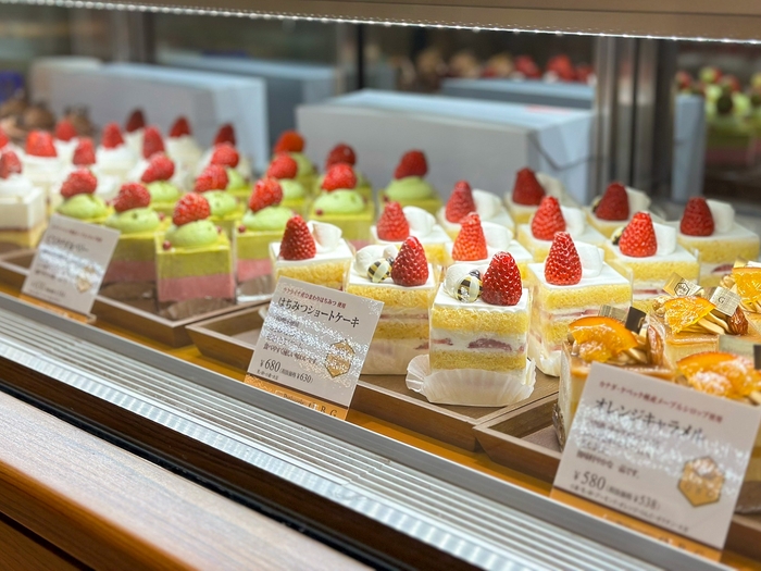 はちみつだけの甘さで仕上げた生クリームが自慢の「はちみつショートケーキ」をはじめ、6種類のカットケーキや、新作の「はちみつプリン」も販売。