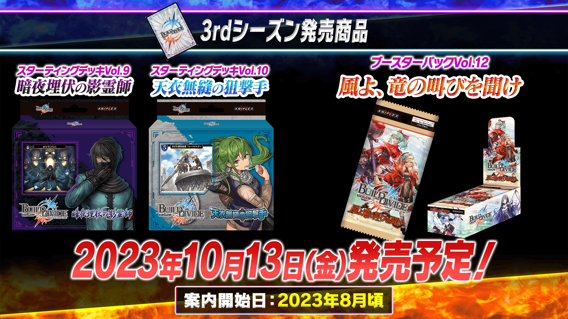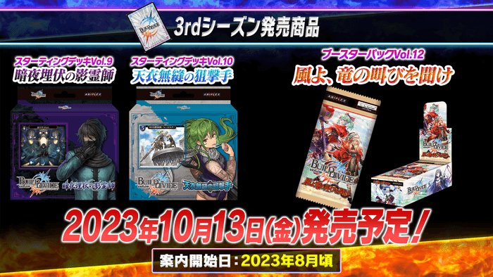 アニプレックスが手掛けるオリジナルトレーディングカードゲーム「ビルディバイド」。2021年10月度に発売した“ブースターパック第1弾「果てなき戦乱の序曲」”を皮切りに、様々な作品とのタイアップ商品も含め数多くの商品を展開中。そして、2023年2月度には「ビルディバイド」の新たなラインとして、アニプレックスの人気作品が集結した新たなるキャラクターカードゲーム「ビルディバイド ‐ブライト‐」の商品展開を開始いたしました。