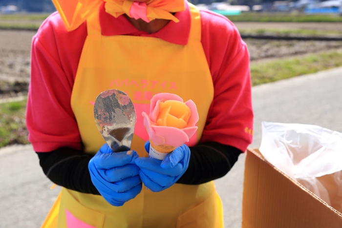 秋田の夏の風物詩「ババヘラ・アイス」。ひとつひとつ手作りされた、バラ盛りと呼ばれるバラの花のように美しく盛り付けられたカップアイスと手軽に食べられる棒付きのキャンデータイプのセットです。
