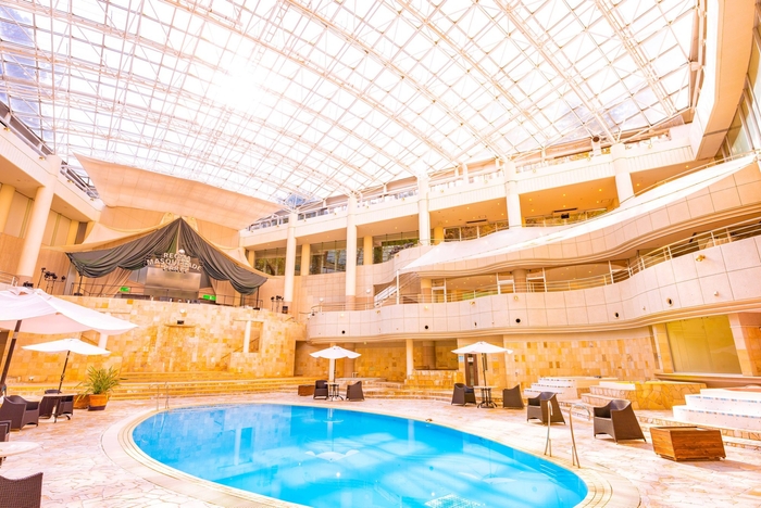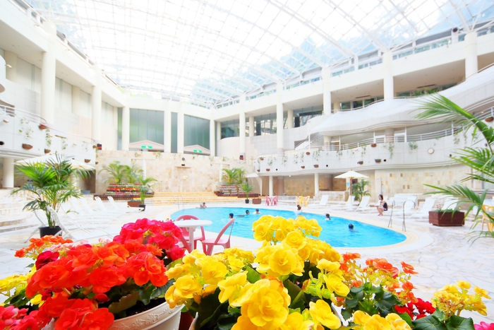 ホテルレオマの森では、全天候型でリゾート風の温水プールがおすすめ。日焼けを気にせずプールが楽しめます。8月中は毎日営業しております。