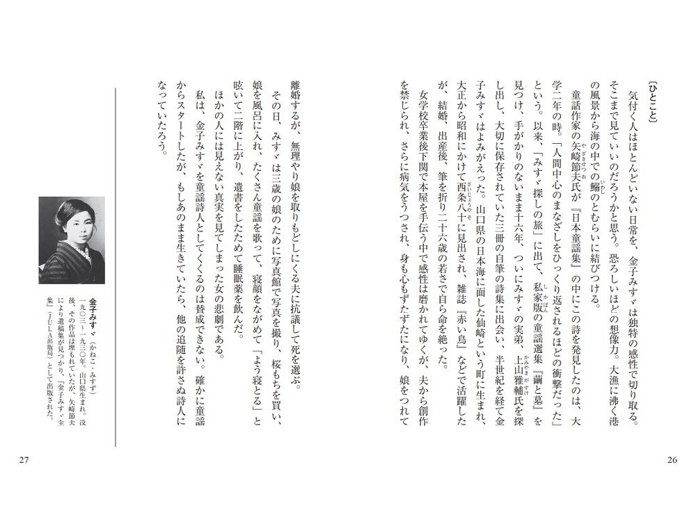 また、それぞれの詩の後には、詩歌を愛する著者ならではの視点で思い入れたっぷりに語られる「ひとことエッセイ」を掲載。人生の折り折りで生きる支えとなってきた詩への敬意が込められた、ノスタルジックな共感を呼ぶ味わい深い内容となっています。