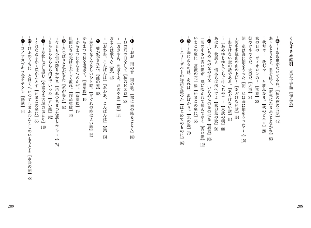 詩の題名がうろ覚えでも、詩中の印象的な一文やフレーズで詩を探すことができる「くちずさみ索引」を巻末に付しています。