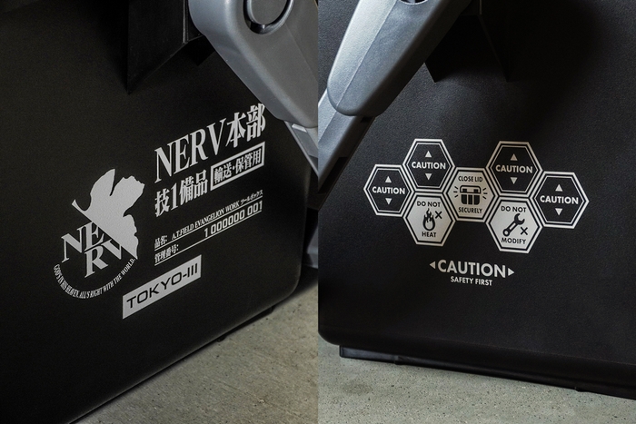 右側は「NERV本部」「技1備品」などを表記。NERV技術開発部技術局第1課の備品をイメージさせるミリタリーな印象。左側には使用する上での注意事項を劇中に登場するハニカム状のインフォグラフィック風にアレンジして表記。作品の世界観と機能性を融合したデザインです。