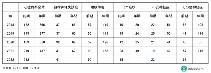 漢方相談薬局、鍼灸院を東京・千葉で20店舗展開している株式会社誠心堂薬局(本社:千葉県市川市、代表取締役:西野 裕一、以下 当社)では、睡眠障害の相談が急増しています。さらに睡眠障害を伴いやすい自律神経失調症といった心療内科に関連する相談も2021年以降、増加し続けています。睡眠障害の新規相談件数は158%増、自律神経失調症は120%増、心療内科関連全体では127%増となっています(2018年と2022年1-6月期比較)。