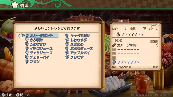 このゲームでは料理を食べることでレベルアップします。料理の中にはパラメータが一時的に上昇したり、状態異常に耐性が付く等様々な効果があります。