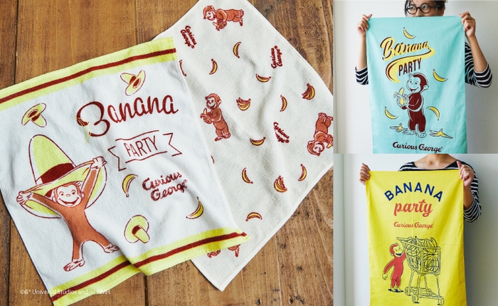 ジョージ&「Banana Party」ロゴと、総柄のリバーシブルエプロンは大人でも着やすいようシンプルなデザインに仕上げています。三角巾付きのキッズエプロン(¥2,750) もご用意していますので、夏休みにお揃いでクッキングを楽しんでみてはいかがでしょうか?夏らしい色味に大きくデザインを入れたティータオルはキッチンを明るく彩ります。また、使いやすいサイズのキッチンクロスは柔らかく手触りの良い素材で仕上げました。
