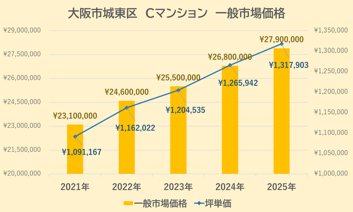 Cマンションの一般市場価格・坪単価の推移は上記【図5】の通りです。