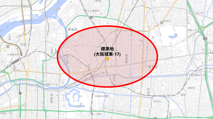 今回は、標準地(大阪城東-17)周辺の下記エリア内のマンション事例①(築10年~19年)、マンション事例②(築20年~29年)、マンション事例③(築30年~45年)を対象に、過去5年の一般市場価格を抽出します。