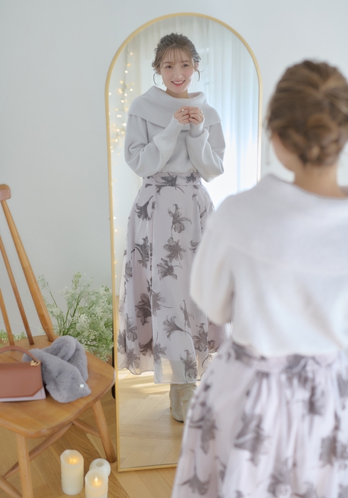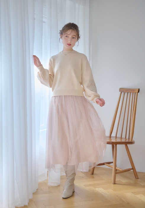 袖のパールデザインが可愛いニットと合わせて女子会にもぴったりなコーデに。