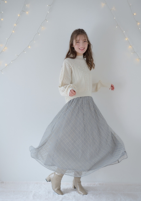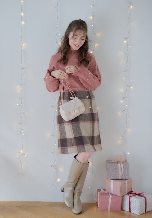 さりげないチェックスカートで華やかさをプラスしたスタイリング。
