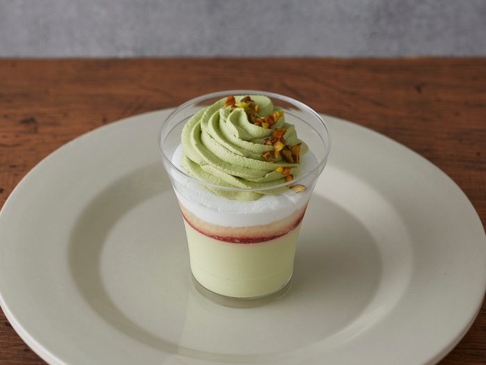 ●商品特長:クリームチーズとピスタチオを使用したリッチなピスタチオチーズムースをベースに、苺ソースや刻んだレモンの酸味を食感のアクセントにした、濃厚なピスタチオパフェです。