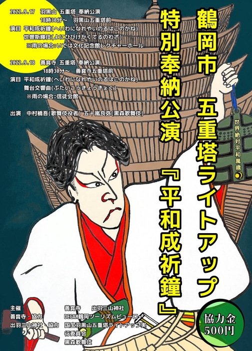 山形県の国宝および無形文化財それぞれの五重塔の前で、鶴岡市出身の歌舞伎役者、中村橋吾氏(成駒屋)が特別演舞を行う。