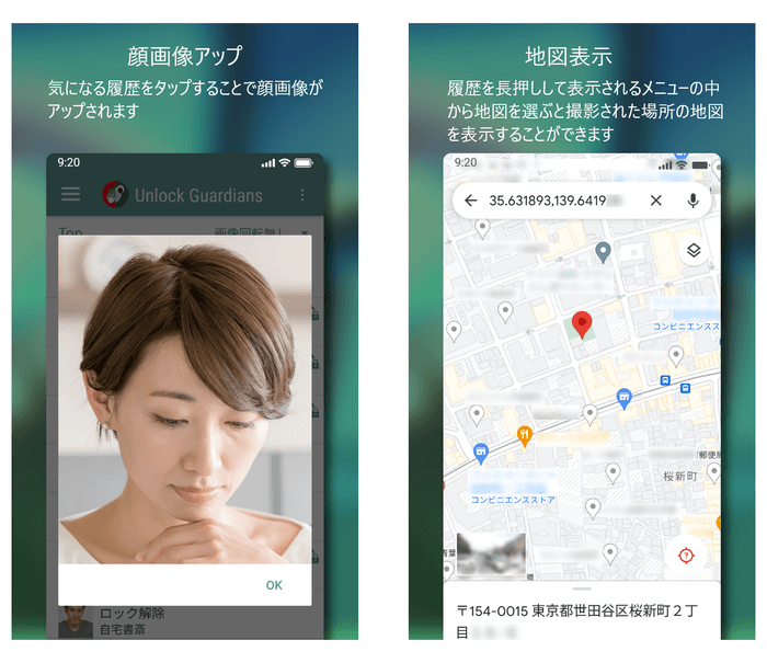 ③端末を紛失した時など、端末が自分の手許になかった時の位置情報を確認する事もできます。もちろん誰かが端末を操作しようとしたらその操作者を記録します。「もしもの時」の安心にもUnlock Guardiansが活躍いたします。