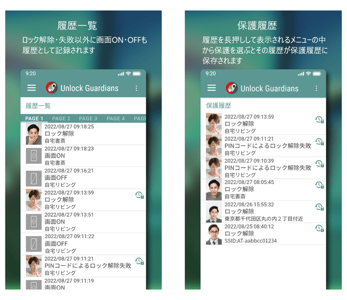 ②「ロック解除」時だけではなく「PINコードによるロック解除失敗」時や、端末の電源ON・OFFに伴う「Unlock Guardiansの起動・終了」時の操作者も撮影・記録します。スマホを『盗み見』しようした人は「未遂も含めて」記録されます。