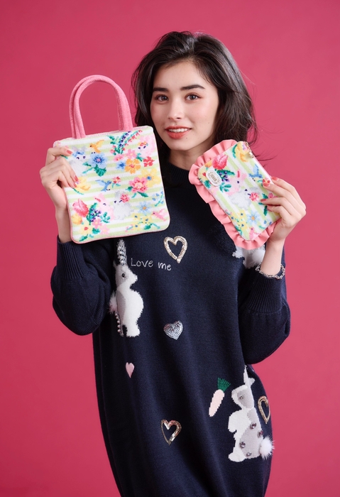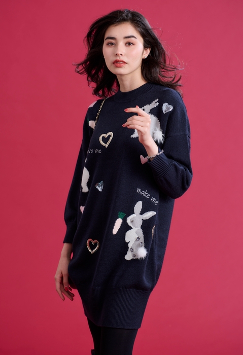 来年2023年の干支である「ウサギ」にちなんで企画したニットワンピース。愛らしい3匹のウサギをメインに、スパンコールや刺繍でハートや英字をあしらいました。