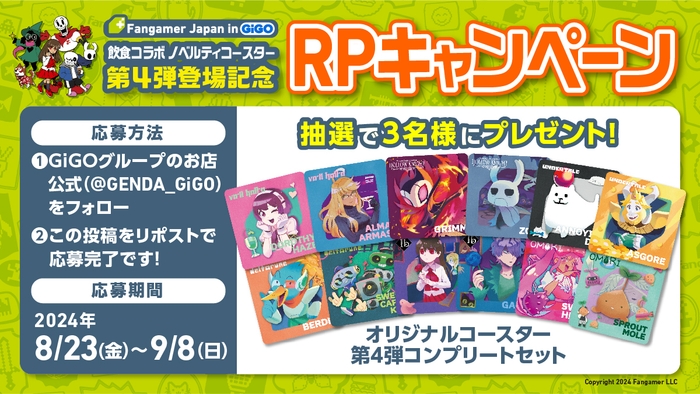 株式会社GENDA GiGO Entertainment(本社:東京都港区 代表取締役社長:二宮 一浩 以下当社)は、「Fangamer Japan in GiGO」での飲食コラボ(ゲーマー焼き、ゲーマードリンク)で提供しているオリジナルコースターが2024年9月1日(日)から新デザインの第4弾に切り替えとなります。