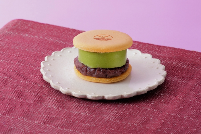 マカロンのようなフォルムの生どら焼き。濃い抹茶が香るムースと、つぶあんの優しい甘さが絶妙な一品。