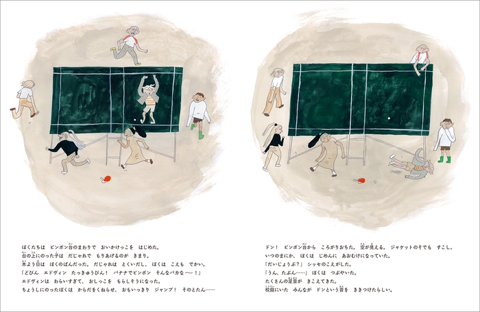 「どびん エドヴィン たっきゅうびん!バナナでピンポン そんなバカな~! 休み時間に友だちとだじゃれ遊びでもりあがり、卓球台の上からジャンプをしたら、 ドン!! じめんにおちちゃった。集まってきた学校のみんなは、あふれでる血にくぎづけ。みんなに注目されるのはちょっといい気分。でもどんどん痛くなってきて......。