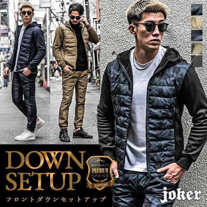 フロント部分にダウンを配合し、裏地にフリースを使用しているため、軽量で抜群の保温性を実現。ストレッチ性を持たせた高機能セットアップ。