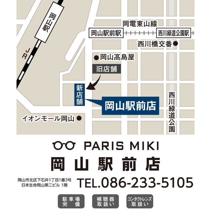 株式会社 パリミキ(本社:東京都港区、代表取締役社長:恒吉裕司)は、2023年11月23日(木祝)岡山県岡山駅前・日本生命岡山第二ビル1階に、パリミキ 岡山駅前店を移転OPENいたします。
