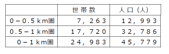 ・店舗から1km圏内は単身世帯比率が54.0%、2人世帯比率は20.9%と全体の7割強が少人数世帯です。