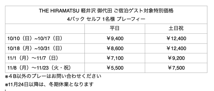 「THE HIRAMATSU 軽井沢 御代田」にご宿泊のお客様を対象にした、太平洋クラブ「軽井沢リゾート」特別価格でのご予約を10月10日より開始いたしました。10月、11月のプレーフィーは、4バックセルフで1名様平日5,500円~9,400円、土日祝7,500円~12,400円と魅力的な価格でのご提供です。プレーのご予約は、「THE HIRAMATSU 軽井沢 御代田」を通してのみ可能となります。ご希望の方はホテルまでお問い合わせください。