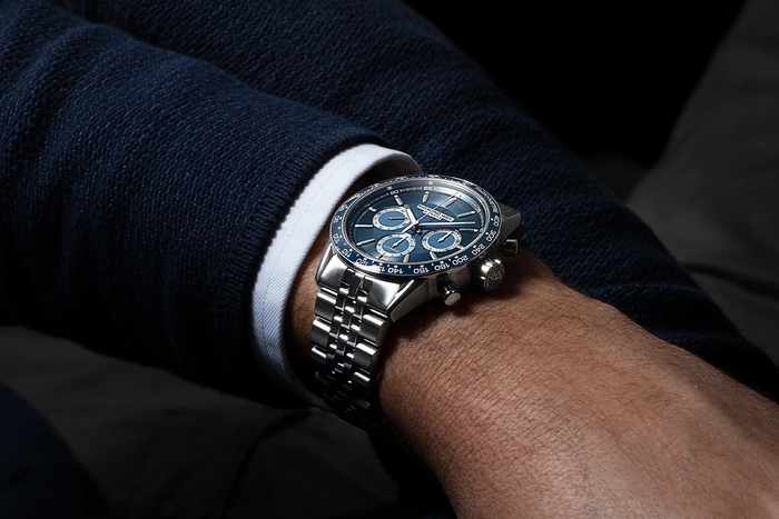 シンメトリーデザインのクロノグラフモデルにブルー文字盤が登場