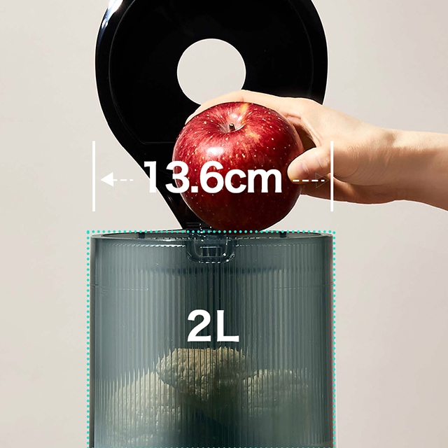 “メガホッパー”と呼ばれる食材貯蔵ドラムは、13.6cmの大きな投入口と2リットルの大容量で野菜と果物が一度にたくさん搾れます。