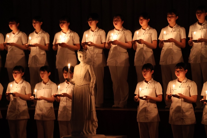 ナイチンゲール像から受け取った灯を手に、2年生26名が厳かにナイチンゲール誓詞を朗唱します。