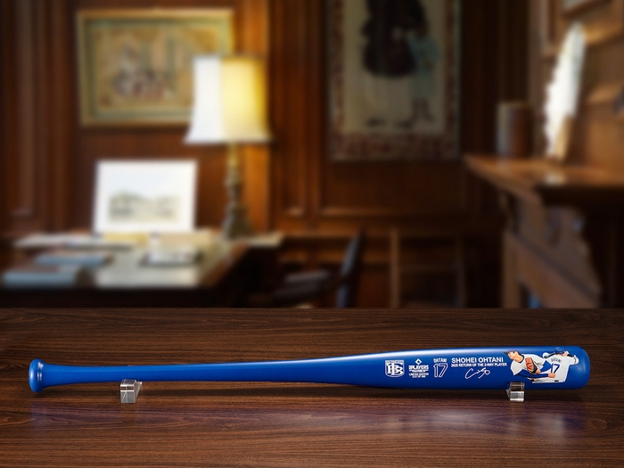 ドジャーブルーを思わせるスタイリッシュな青色のバットには、大谷選手のサインをプリント。
