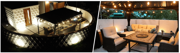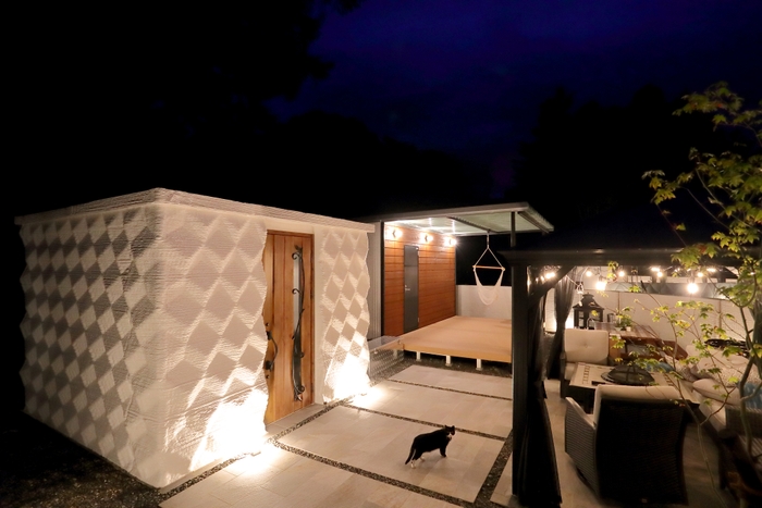 3Dプリントハウスのベッドルームの他にトイレ、洗面、シャワーを備えたサニタリー棟と薪風呂(9月中旬予定)、サイト全体を見渡す東屋の優雅なリビングで構成されており、ライトアップ時には3Dプリントの凹凸が陰影を生み出し、よりラグジュアリーな雰囲気を楽しめます。