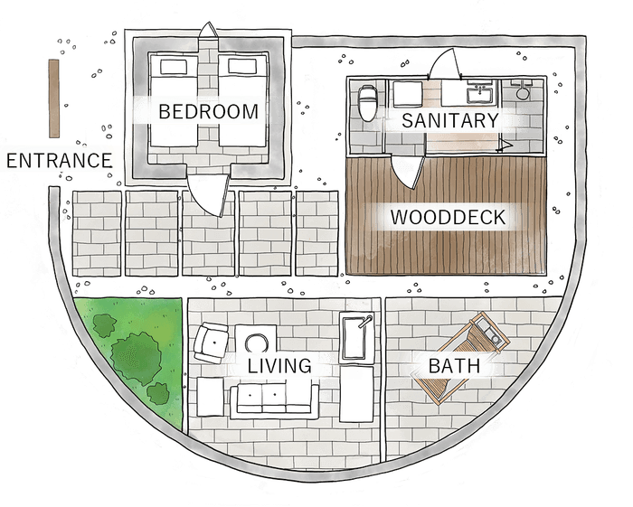 グランピングのサイト内は3Dプリントで作られた高さ1.2mの壁で囲われており、座った時に丁度視界が外と遮断され木々だけが見える造りとなっています。