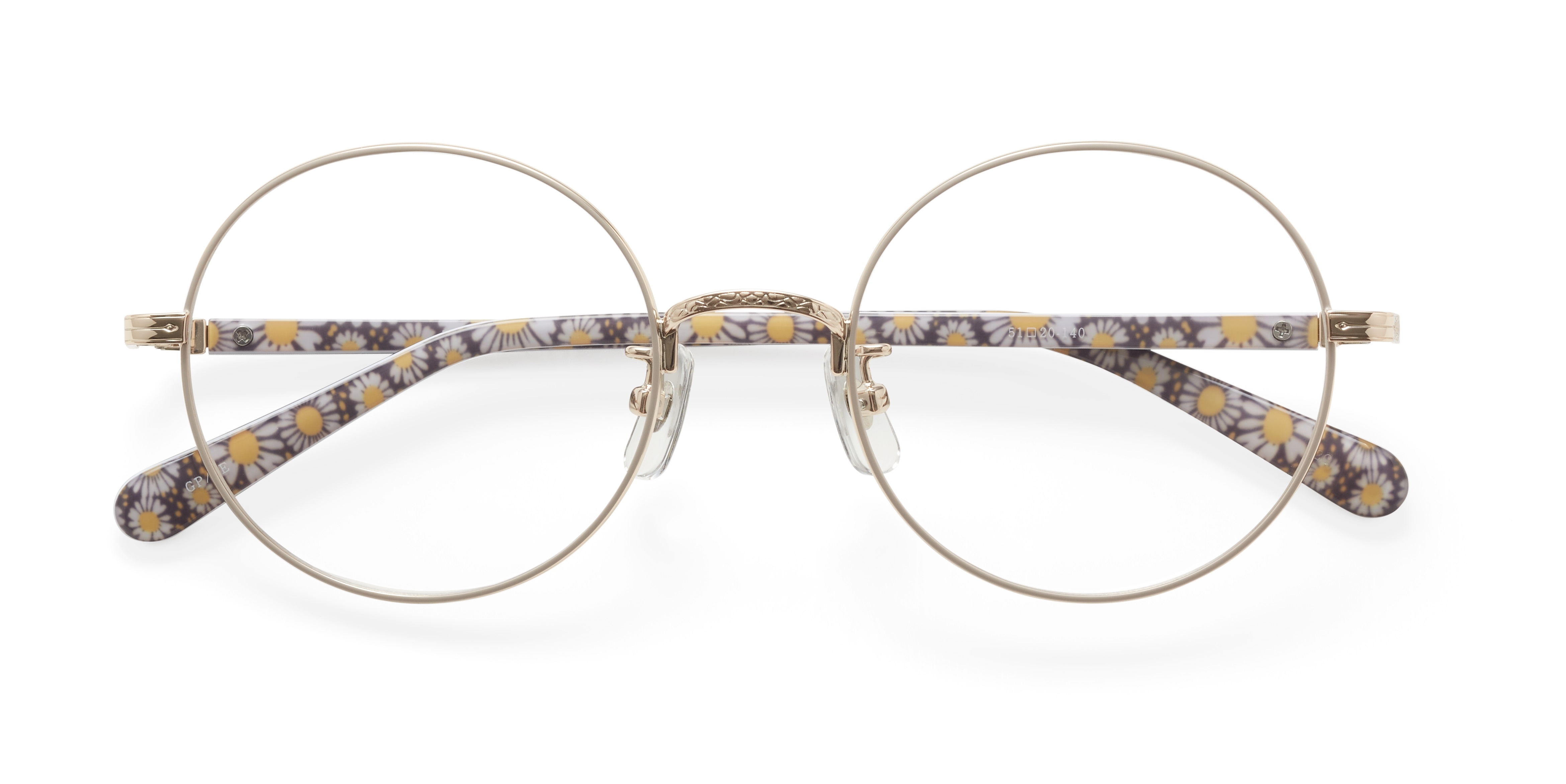 真ん丸なラウンド型のレンズシェイプ。テンプルは003モデルと同様にオリジナルのアセテート生地を長めに使用し、「セル手」と呼ばれる仕様になっています。