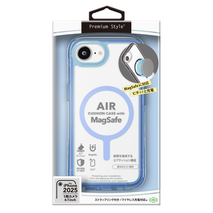 各種MagSafeアクセサリーに対応した360°エアクッション構造でiPhone本体を衝撃から守るiPhone 16e対応のエアクッションケースです。