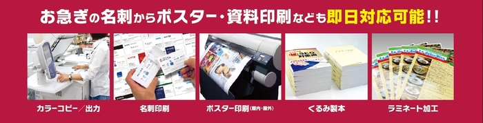即日の仕上がりも可能な迅速で幅広いプリントサービスで、地域のみなさまのビジネスをサポートいたします。