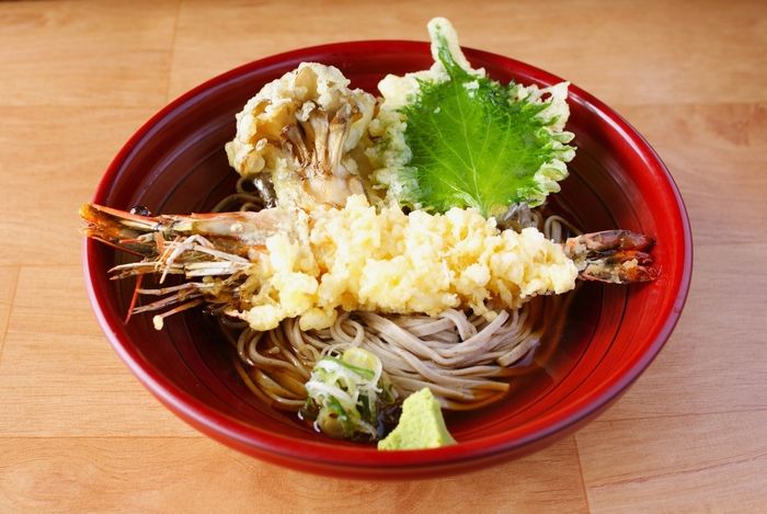 石臼挽きのそば粉を使用。コシ・ツヤ・風味が自慢の信州二八そばに、プリプリ食感が特徴の有頭大海老と、長野県産の舞茸を天ぷらにしてトッピング。