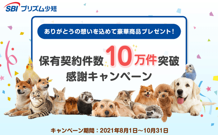 SBIプリズム少額短期保険株式会社(本社:宮城県仙台市、代表取締役社長:遠藤 匡、以下「当社」)は、2021年8月1日(日)から10月31日(日)までの期間で「ありがとうの想いを込めて 保有契約件数10万件突破感謝キャンペーン」を実施いたしますので、お知らせいたします。
