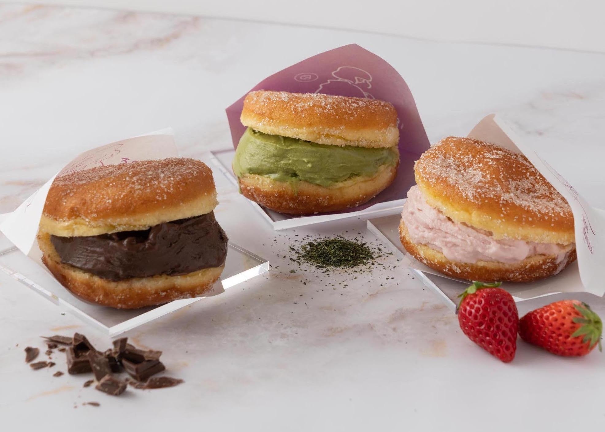 この度、厳選素材の商品を提供する両ブランドから、ふわふわのイースト生地にひんやり甘いジェラートをサンドした、夏のドーナツ「ジェラートサンドドーナツ」が登場しました。フレーバーは、ヴィーガンなのに濃厚な味わいの「ヴィーガンチョコレート」、イチゴとはちみつがマッチした甘酸っぱい「いちごミルク」、京都らしい宇治抹茶とオーガニック緑茶を組み合わせた「宇治抹茶」の全3種。暑い夏がやってくるシーズンに、新感覚の冷たいスイーツをお楽しみください。片手で食べられるので、京都散策のお供にもぴったりのスイーツです。