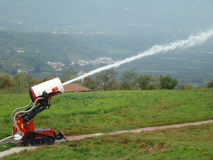 噴霧放水は延焼防止に威力を発揮。タービンによる強力な送風で水滴を大量に遠くまで飛ばします。水滴が気化する際の冷却効果により、短時間に少ない水で消火できます。