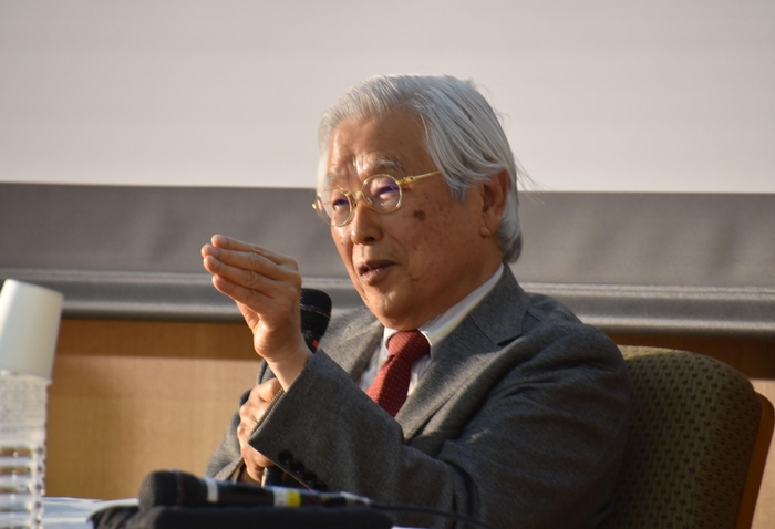 さまざまな応用が期待される炭素素材「カーボンナノチューブ(CNT)」を発見した飯島終身教授は「ノーベル賞級の研究は知的好奇心に導かれたセレンディピティ(偶然の発見)によるものも多い」と指摘。CNTの発見につながった要因として専門である電子顕微鏡の技術を徹底的に身につけたことを挙げ、「自分の得意な分野、技術を持って研究に挑んでほしい」と訴えました。