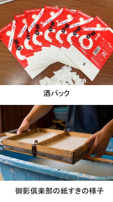 当社は、工場から発生する酒パックの工場損紙をリサイクル活用するため、製紙原料として「御影倶楽部」に提供しています。「御影倶楽部」のメンバーが手すきした紙をもとにして、様々な酒パックリサイクル品が商品化されています。